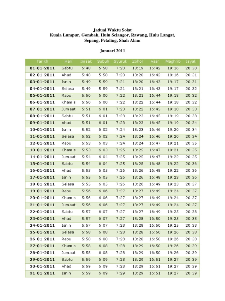Jadual Waktu Solat Negeri Selangor Zon 1 Tahun 2021 Majlis Perbandaran Sepang